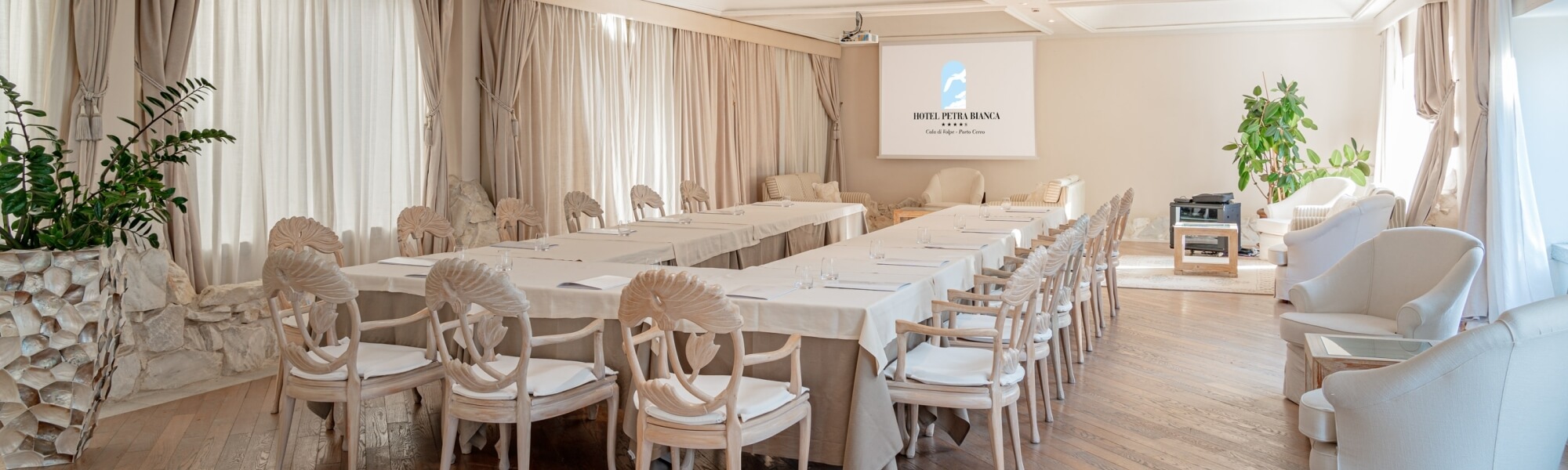 In the heart of Cala di Volpe in Porto Cervo, Hotel Petra Bianca offers a spacious venue for meetings and private events. The meeting room, filled with natural light and with direct access from the hotel’s main areas, is ideal for business gatherings and special occasions. A dedicated team provides constant support and meticulous attention to detail. To enrich the experience, guests can enjoy coffee breaks, business lunches, or full-course dinners served either in the panoramic restaurant or on the poolside terrace, with a breathtaking view over the Bay of Cala di Volpe.